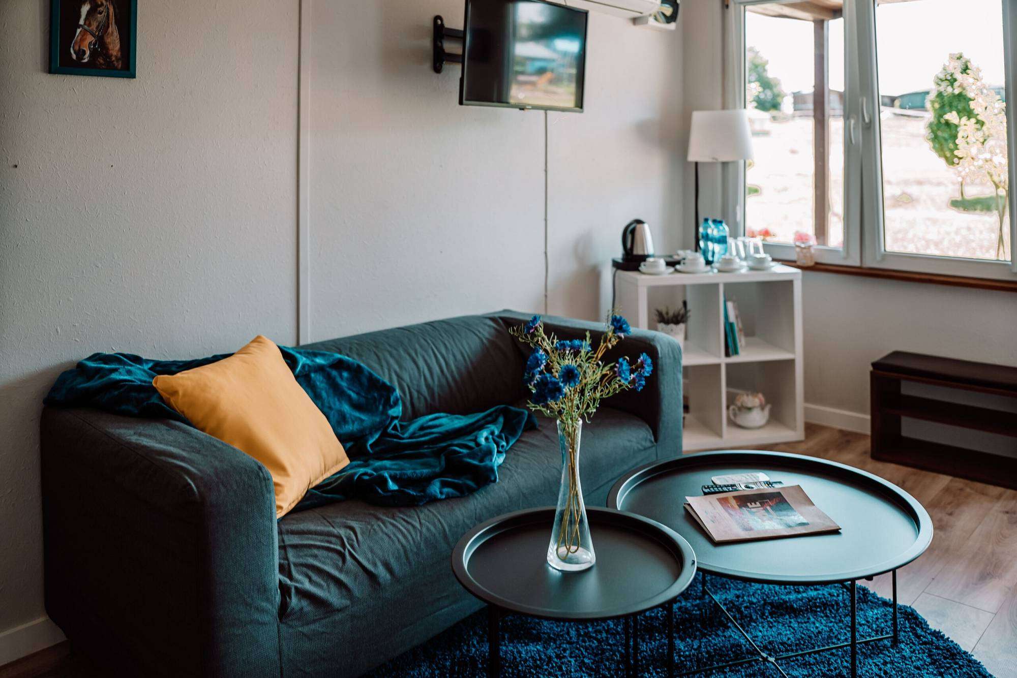 Zakwaterowanie w klimatyzowanych i ogrzewanych domkach z Wi-fi lub w pokojach w Pałacu, pełne wyżywienie, również z opcją wegetariańską.